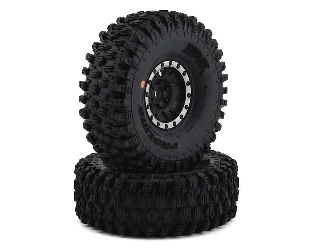 Pro-Line Hyrax 1.9″ Tires are now available mounted on Impulse Black/Silver internal Bead-Loc wheels. Designed for maximum grip on the toughest terrain, the Hyrax tire is ready for anything your Scale Adventure might throw at you. The Hyrax features an aggressive and open tread pattern with each tread block containing multiple Sipes for incredible tread flex. The highly detailed connected tread on the sidewall of the Hyrax extends out for unmatched side-hilling performance. The Hyrax also features futuristic stepped tread blocks that create even more forward gripping edges that dig into slick rock like no other scale tire Pro-Line has produced to date! The Hyrax is made from Pro-Line’s Legendary G8 material, so you know it provides performance you can depend on.