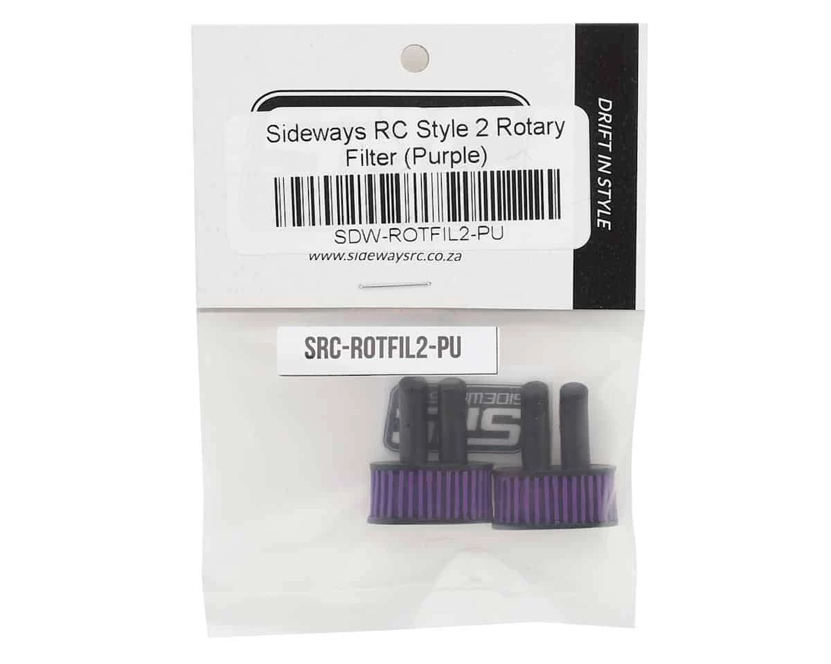 This is a set of Sideways RC Purple Style 2 Rotary Filters, detailed scale option parts to add realism to any 1/10 drift kit engine. These plastic parts have been open cast molded out of quality polyurethane instead instead of 3D printed, keeping the cost down and quality up. These rotary filters are handmade with the colors infused directly into the product in multiple pigment options. This pack includes two molded plastic rotary filters and adds a high level of detail to any drift application.