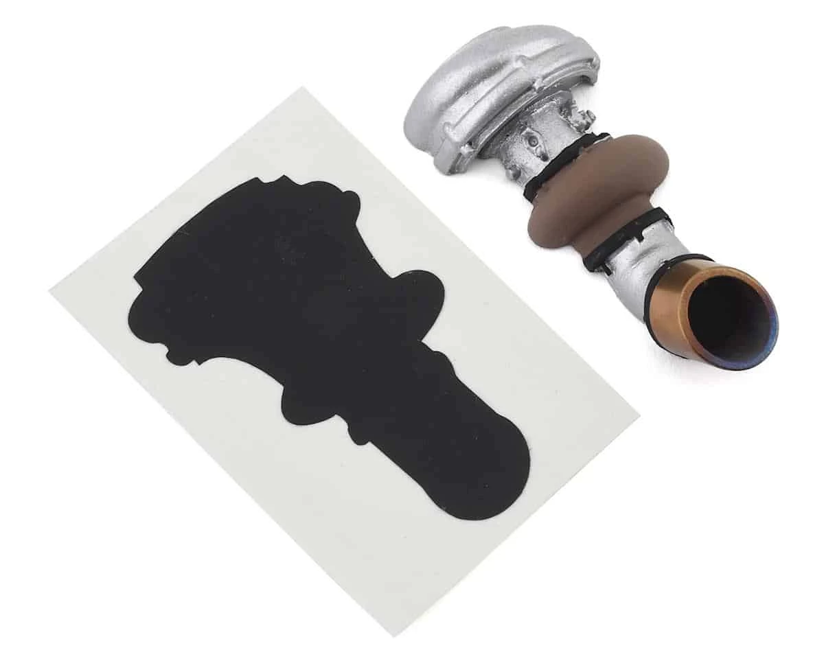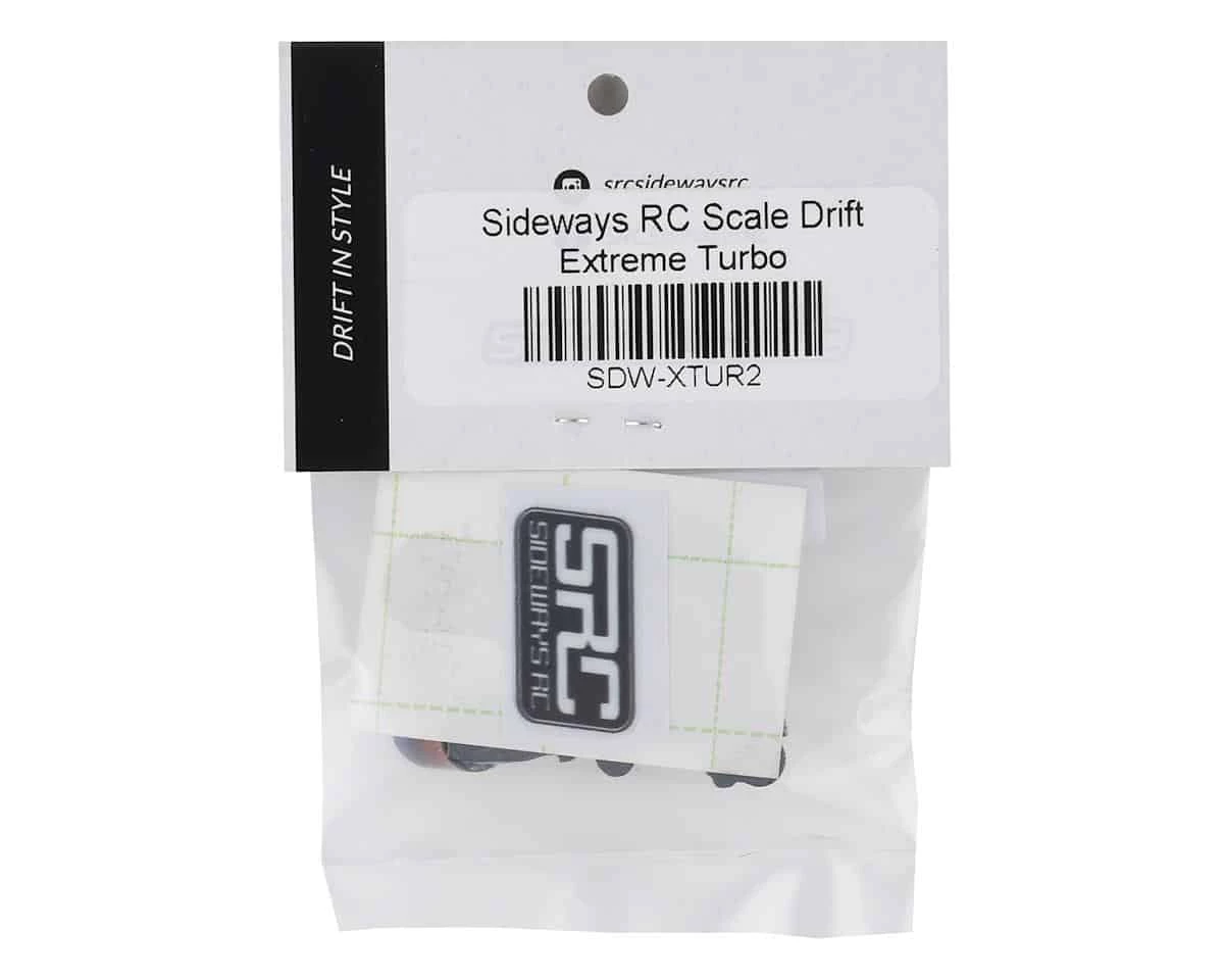 This is a Sideways RC Scale Drift Extreme Turbo, a detailed scale option part to add realism to any 1/10 drift kit exhaust. This plastic part has been open cast molded out of quality polyurethane instead instead of 3D printed, keeping the cost down and quality up. The half turbo is handmade with the colors infused directly into the product in multiple pigment options and a realistic paint scheme applied. This pack includes one molded plastic Extreme Turbo, and a template decal to help with mounting.