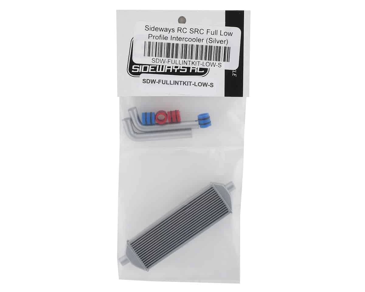 This is a Sideways RC Scale Drift Full Low Profile Intercooler, a detailed scale option part to add realism to any 1/10 drift kit engine bay. This plastic part has been open cast molded out of quality polyurethane instead of 3D printed, keeping the cost down and quality up. The intercooler is handmade with the colors infused directly into the product in multiple pigment options and a realistic silver paint scheme applied. This pack includes one molded plastic full intercooler, left and right pipe attachments and blue and red fitting options for installation.