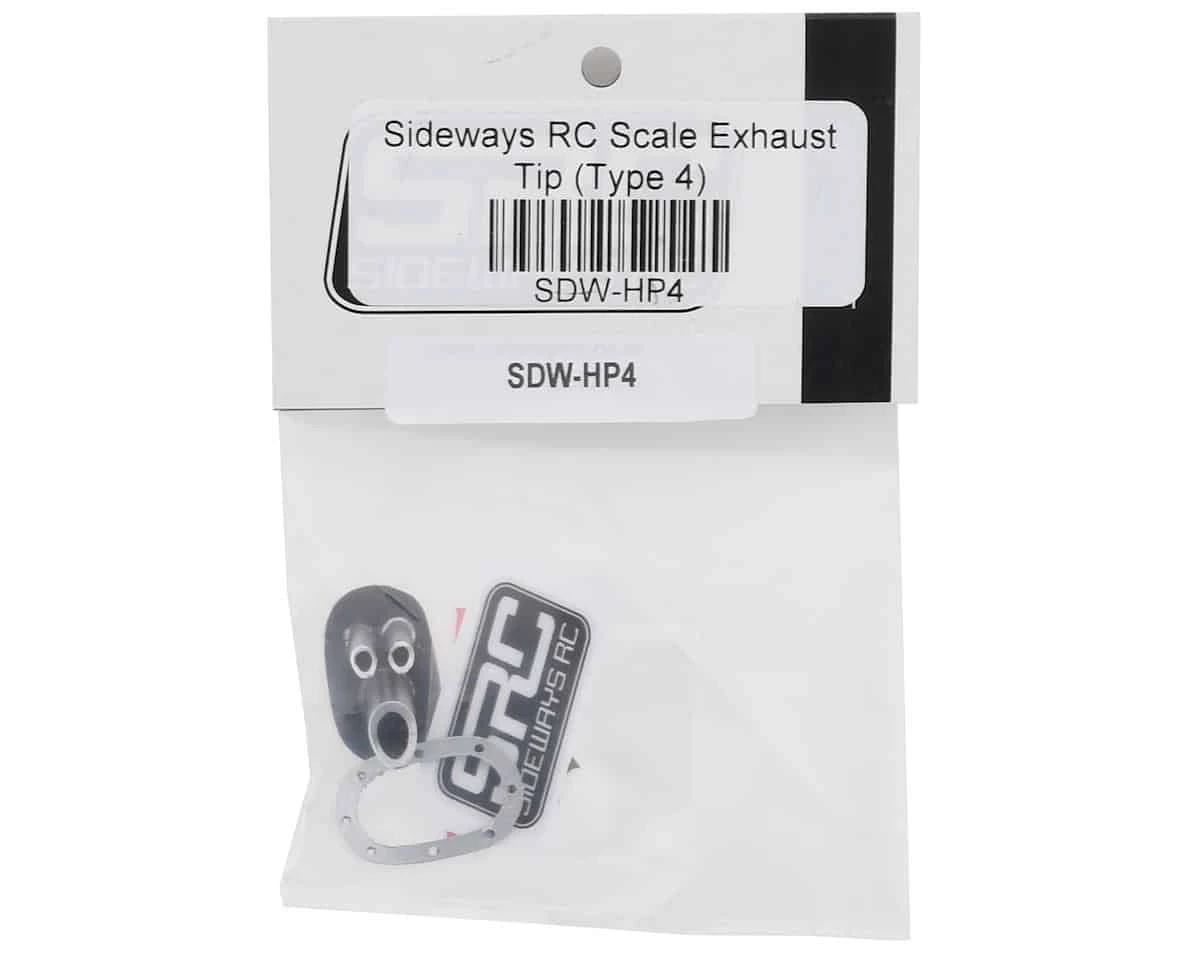 This is a Sidways RC Scale Exhaust Tip Type 4, a detailed replica of the real world item that will add an extra level of realism to the exterior of your 1/10 scale RC build. This plastic part has been open cast molded out of quality polyurethane instead instead of 3D printed, keeping the cost down and quality up. It is handmade with the coloring infused directly into the product, delivering a consistent, clean finish. This pack includes one scale exhaust tip with silver accents.