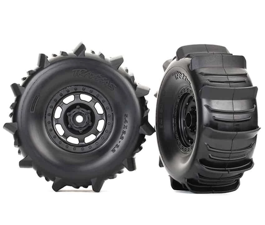 Traxxas paddle tires offer unbeatable traction in sand, snow, mud, or any loose surface. Paddle tires feature outrageously strong scoops combined with strengthening ribs and TSM-rated glue joints to provide a whole new dimension in traction and off road fun. Paddle tires come mounted and pre-glued with foam inserts on black Desert Racer® wheels for no-hassle, out-of-the-box bolt-on